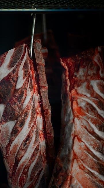 Pre-cooked prime rib should be stored in the refrigerator at a consistent temperature below 40°F to prevent bacterial growth․ Place the prime rib in its original packaging or a sealed‚ airtight container to maintain moisture and flavor․ If the packaging is opened‚ transfer the meat to a food-safe container with a tight-fitting lid․ Ensure the meat is kept away from strong-smelling foods‚ as it can absorb odors easily․ Use within 3 to 5 days for optimal quality․ Always check for signs of spoilage‚ such as an off smell or slimy texture‚ before consuming․ Proper refrigeration ensures safety and preserves the prime rib’s tenderness and taste․